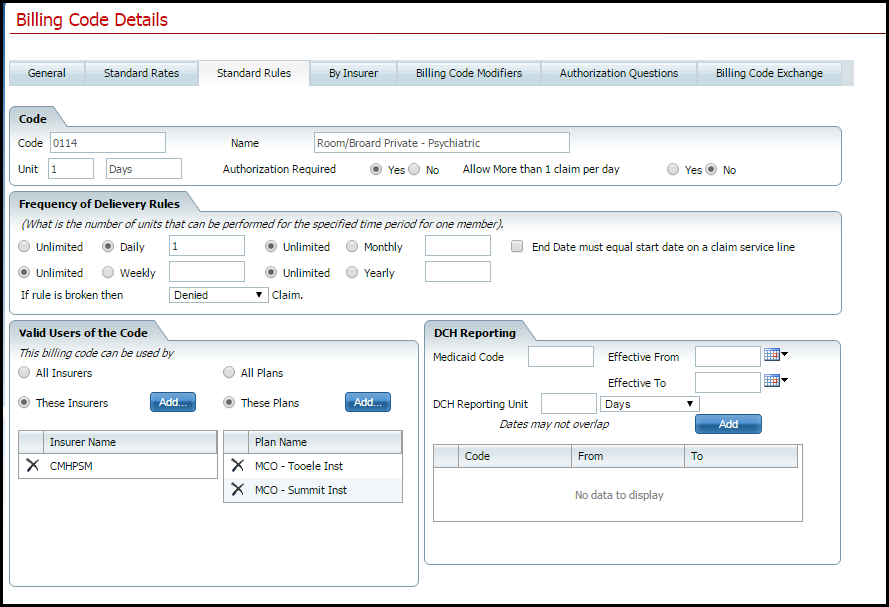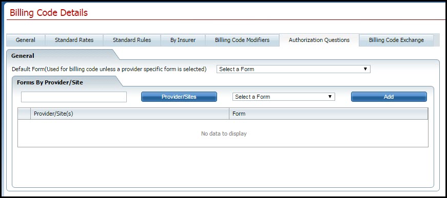 This tab is used to select a custom DFA form which is used to make a utilization management decision on an authorization for this billing code. The form is built each time an authorization is requested for this billing code.
