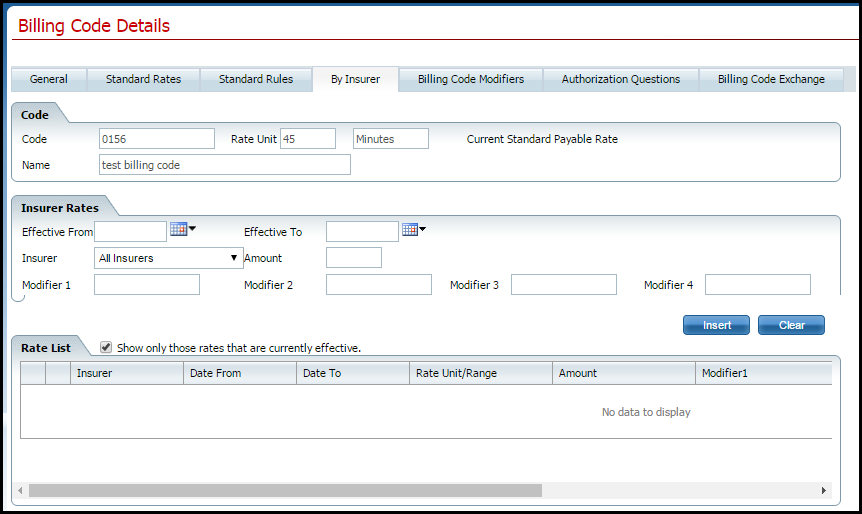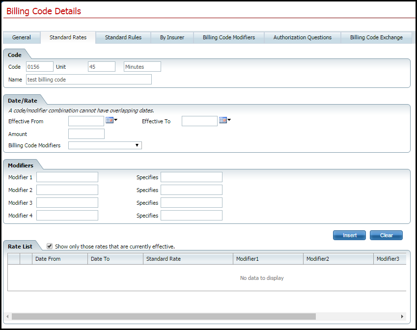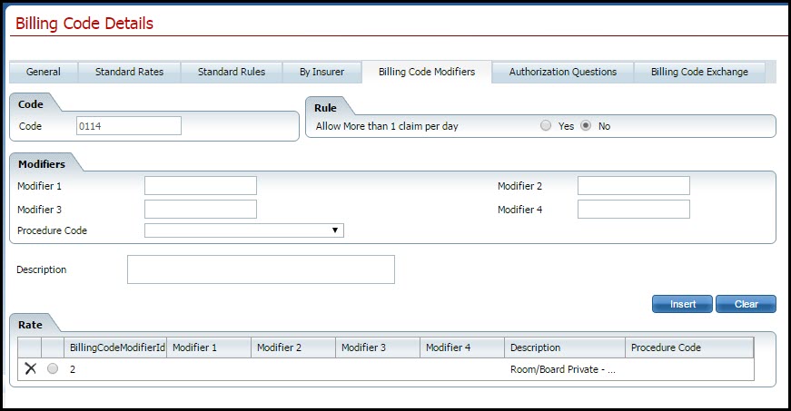 Complete the Billing Code Modifiers tab. When you complete the fields in the Modifiers section, be sure to click Insert to add the information to the system and update the list in the Rate section.